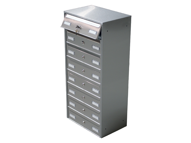 Lokatorska skrzynka na listy, do użytku wewnętrznego, montaż natynkowy oraz podtynkowy, ułożenie korespondencji poziome. Każda skrytka zaopatrzona w 2 klucze oraz solidny zamek. Korpus skrzynki, półki jak i ściana tylna wykonana z blach galwanizowanych malowanych proszkowo. Nitowana konstrukcja. Standardowo 1 szyld oraz perforacja.