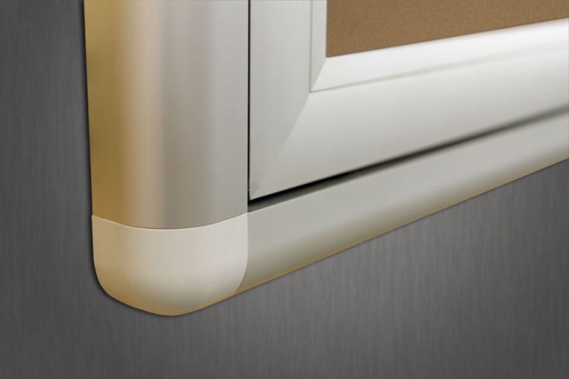 Elegancka o klasycznym wyglądzie gablota wykonana z odpowiednio zaprojektowanych profili aluminiowych anodowanych na kolor srebrny, łączonych za pomocą plastikowych narożników w kolorze szarym lub czarnym.