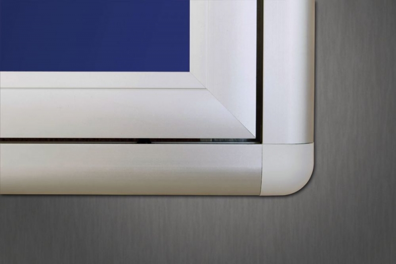 Elegancka o klasycznym wyglądzie gablota wykonana z odpowiednio zaprojektowanych profili aluminiowych anodowanych na kolor srebrny, łączonych za pomocą plastikowych narożników w kolorze szarym lub czarnym.