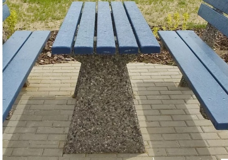 Łatwy w dopasowaniu do innych mebli miejskich i elementów małej architektury miejskiej. Dzięki użytej podstawie z betonu płukanego to trwały element betonowy. Co więcej, posiada fundament, a drewniane elementy blatu zabezpieczono impregnatem. Co więcej w produkcie znajduje się komplet ocynkowanych śrub montażowych